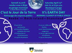 ![]() Nettoyage des espaces publics / Clean up of public spaces Pour plus d'information, contacter Sylvain Matte à JourdelaTerreStanstead@gmail.com For more information, contact Sylvain Matte at JourdelaTerreStanstead@gmail.com